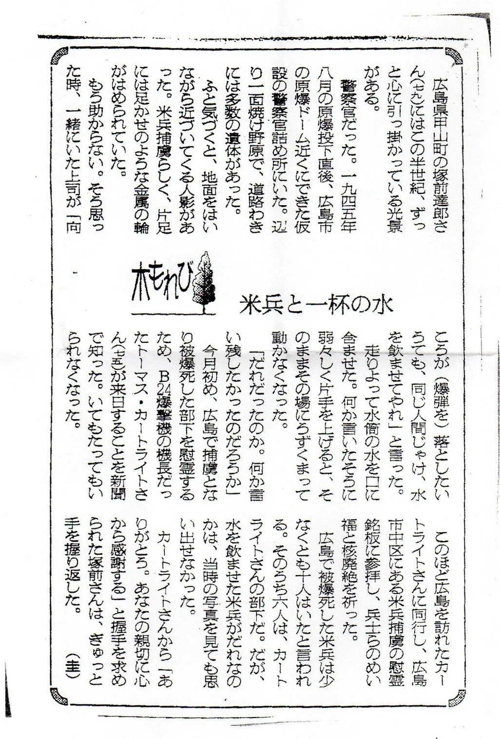 “I happened to look forward and saw someone was coming towards me crawling on the ground. When I looked at him, he was an American. For an instant, I hesitated. Shall I help him, or leave him alone? On one of his legs was a metal ring like part of a fetter, and he seemed significantly weakened. “He won’t be able to survive.” As I thought this, my senior policeman who was stationed with me muttered, “He was also hit by the bomb they dropped.” He added, “He is a human being, same as us. Give him some water.” Mr. Tsukamae ran to him and gave him some water from his water bottle. After he drank some, the American soldier held his hand feebly as if he wanted to say something, but he collapsed on the spot.