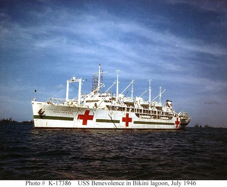 “Late that evening I was one of the last to board a landing craft which headed out into the bay to berth alongside a beautiful white hospital ship - U.S.S. “Benevolence.” It’s name was more than upheld, for never was such kindness, gentleness and understanding, displayed as by the officers, nurses, doctors and men of that magnificent American vessel.”