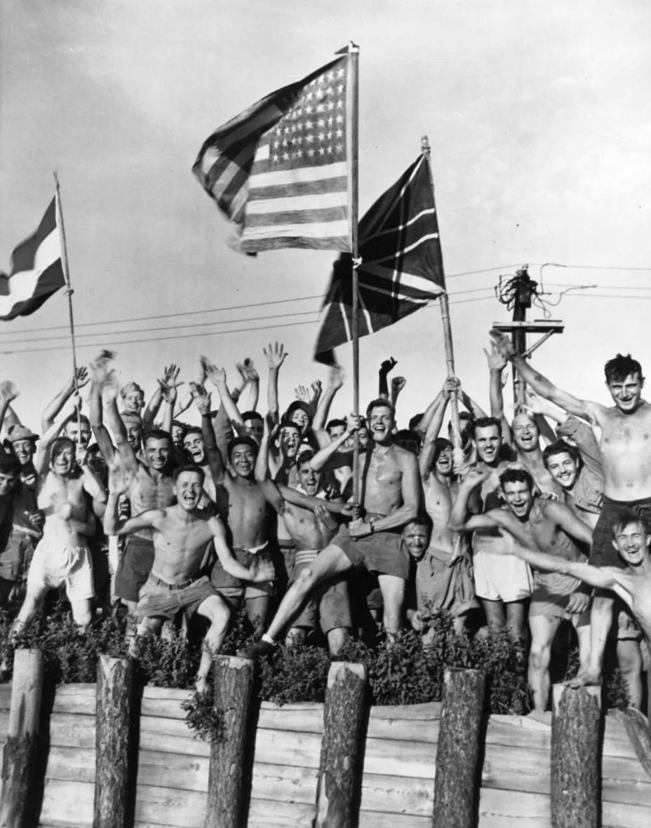 Lt. Tom Cartwright appears in this iconic photograph by John Swope. Cartwright is wearing a shirt, third from the right. These men were liberated on 29/30 August, 1945, from the island POW camp, Omori, near Yokohama. The landing party was led by Commodore R. W. Simpson and Commander Harold Stassen, with permission directly from Admiral Halsey. Photo credit: John Swopes or George P. Gates, Jr., colorized version obtained from unattributed work, WWII Colourized Photos/Facebook.