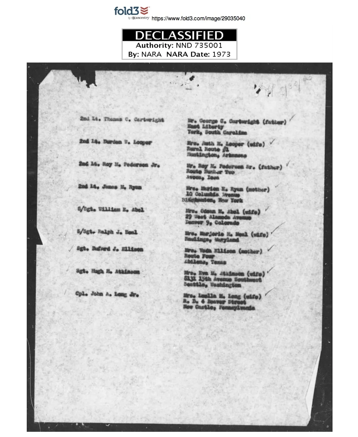 Like many crews, Cartwright's became very close. The team was formed late in the war. After basic training, flight training, navigation and bombing training, their long anticipated deployment the Pacific Theater of Operations was interrupted for a recall to advanced training in the then new radar bombing technology. The crewmen’s backgrounds were varied from shockingly dirt-floor poor to urban New York. The next-of-kin contact information, shown below, was attached to the Missing Air Crew Report (MACR).