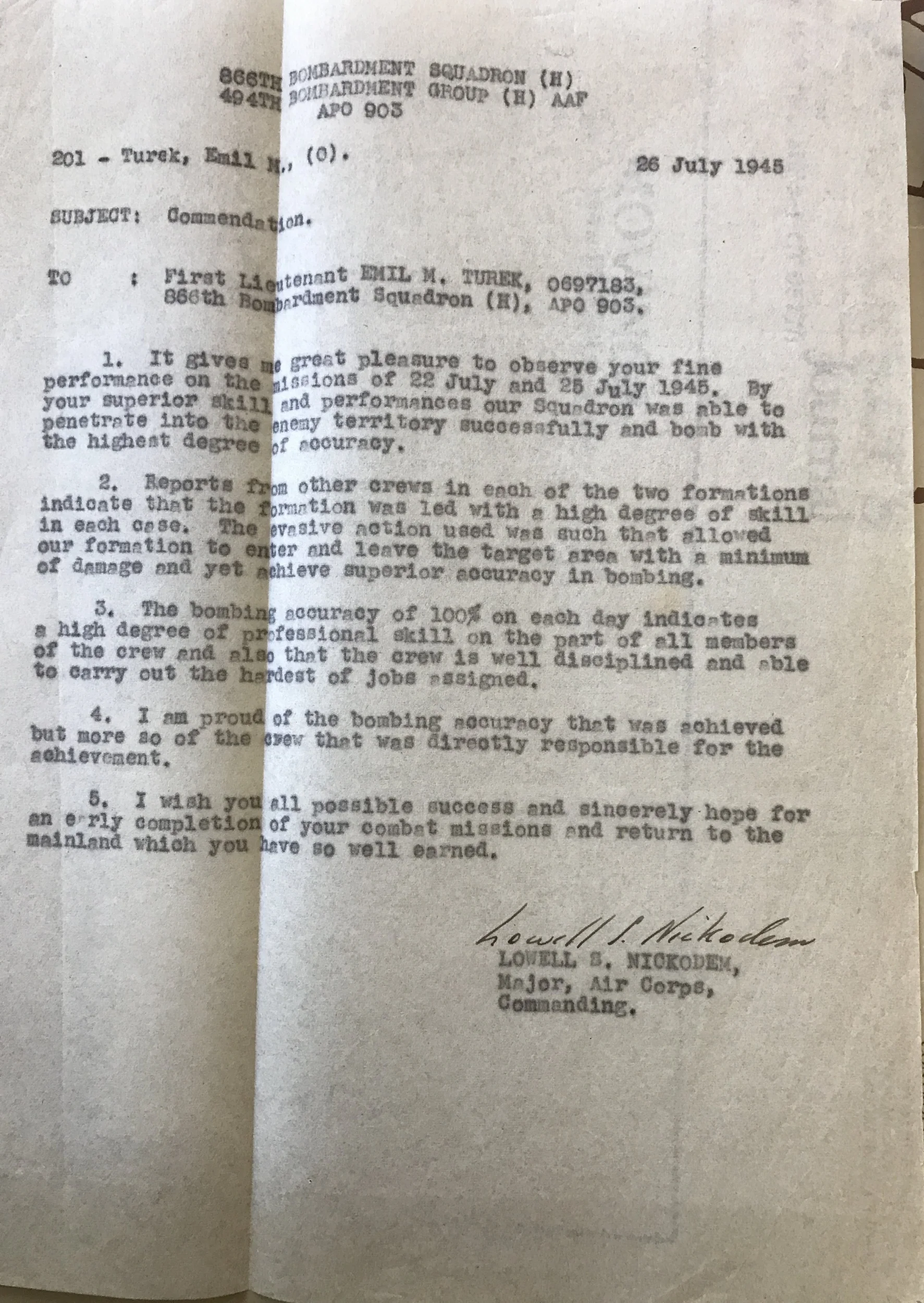 After flying nearly three dozen combat missions with Kelley's Kobras, the 494th Bombardment Group, Turek led the 866th Squadron on bombing missions from the Yonton airfield on American-held Okinawa to targets in China and Japan and was quickly recognized for his skill at evading ground defenses. His crew placed 100% of their bombs on target on two missions within a week of the Battleship Haruna mission. That performance led to Turek's commendation just two days before he was assigned to lead the fifth squadron of the 494th's attack on the Haruna.